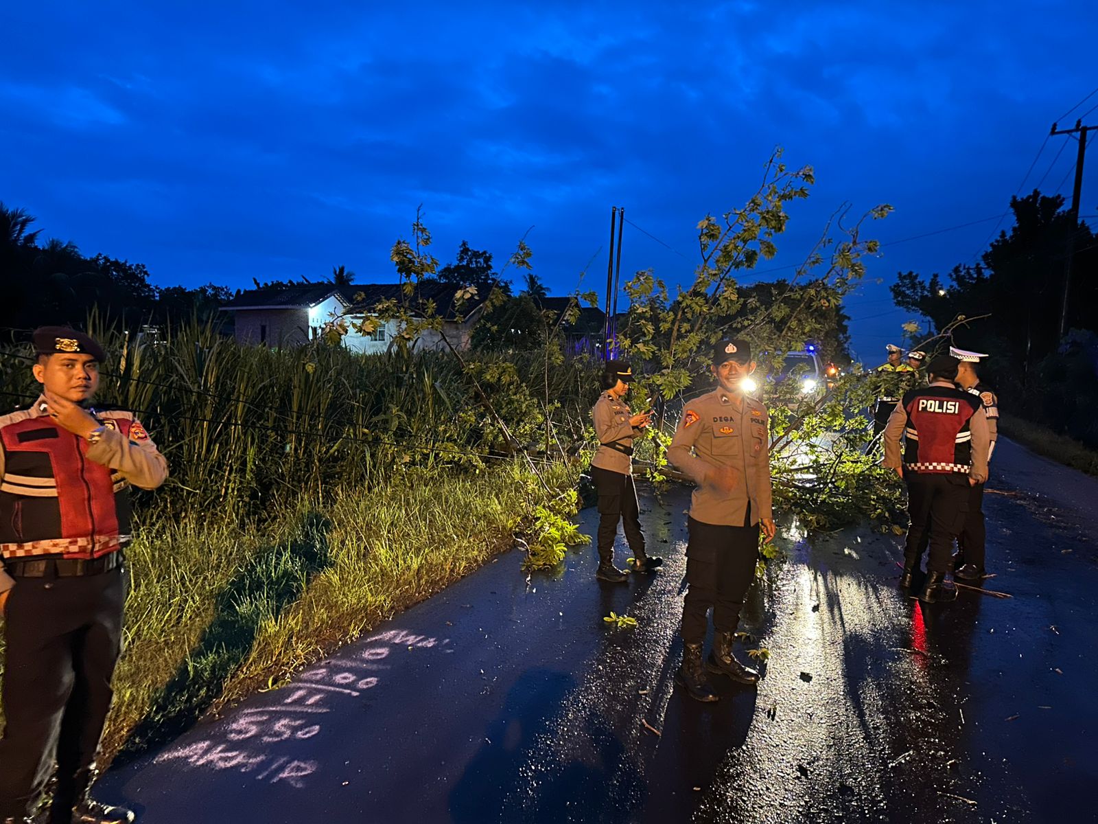 Setelah menerima informasi dari warga melalui Posko Polres, tim yang terdiri dari personel kepolisian secara langsung bergerak menuju lokasi kejadian untuk melakukan peninjauan dan evakuasi pohon tumbang. Langkah cepat ini dilakukan demi mencegah potensi bahaya lanjutan, termasuk terjadinya kemacetan panjang dan risiko keselamatan bagi pengguna jalan yang melintas di area terdampak.